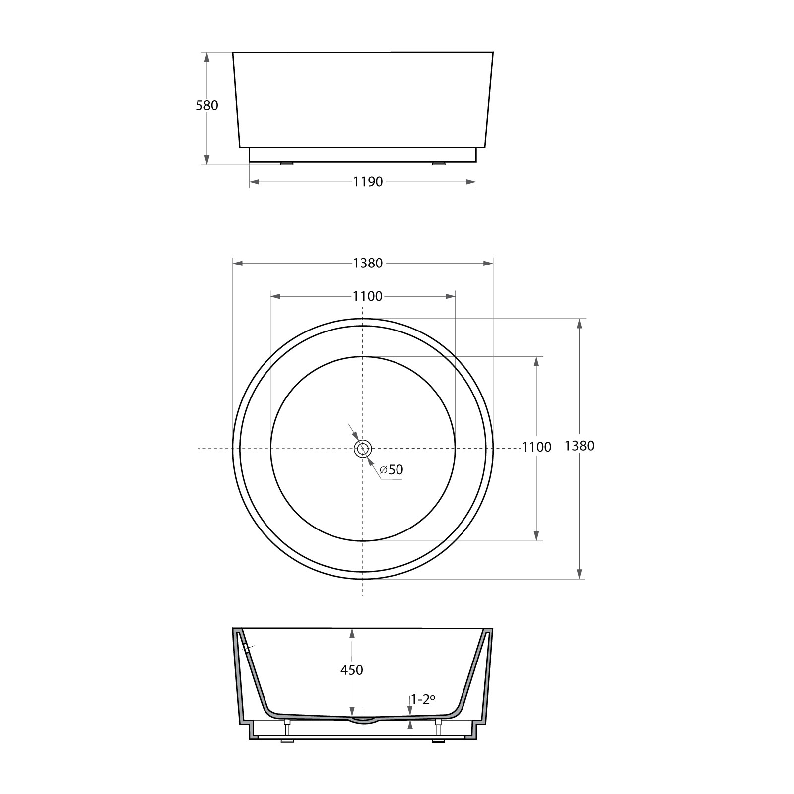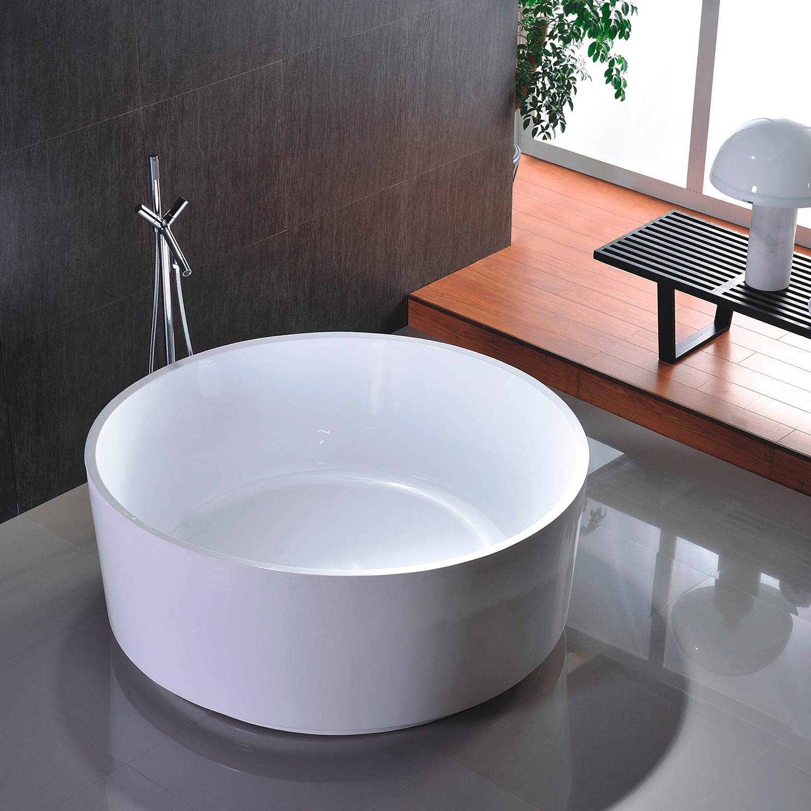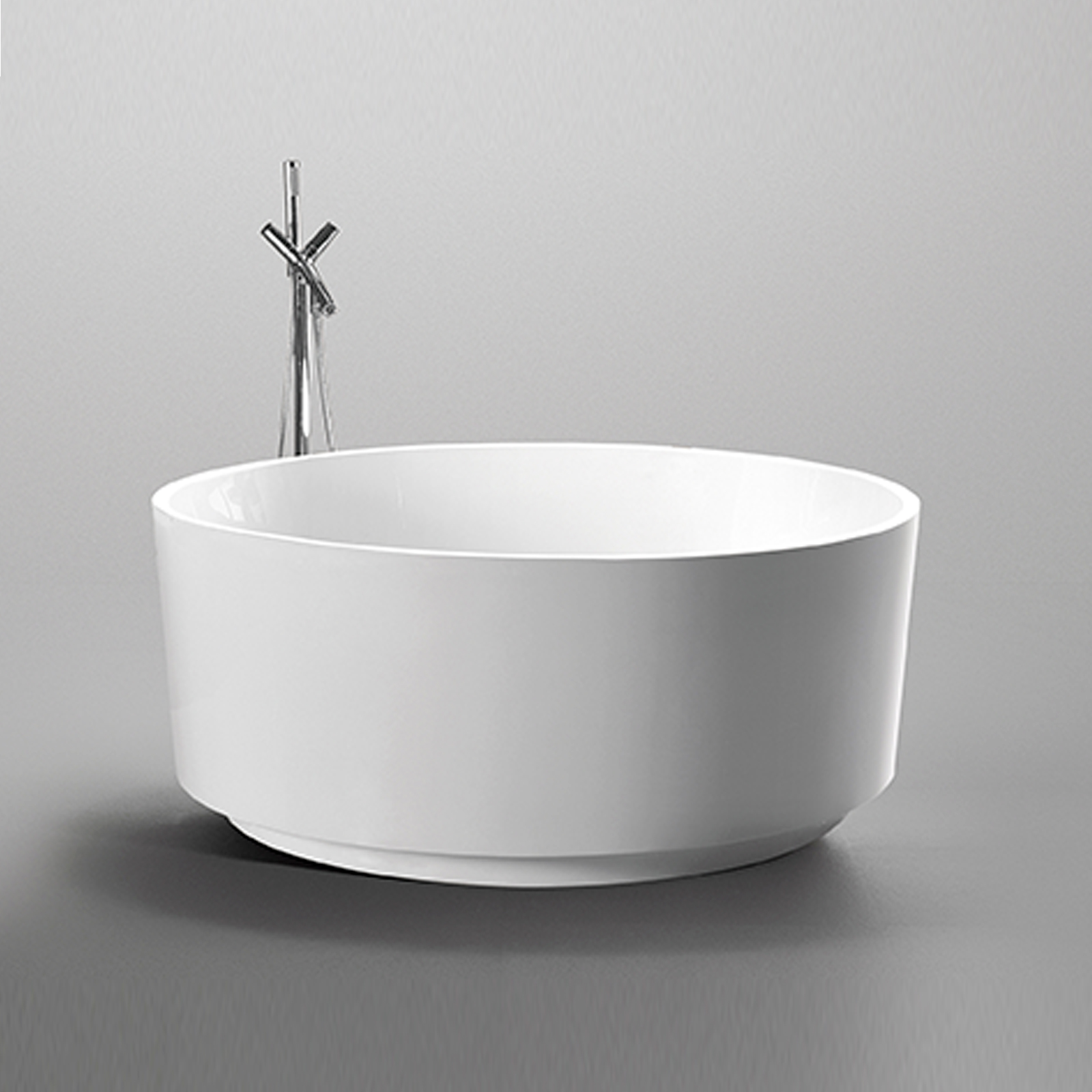 Banheira redonda acrílica branca reforçada a fibra de vidro e resina.